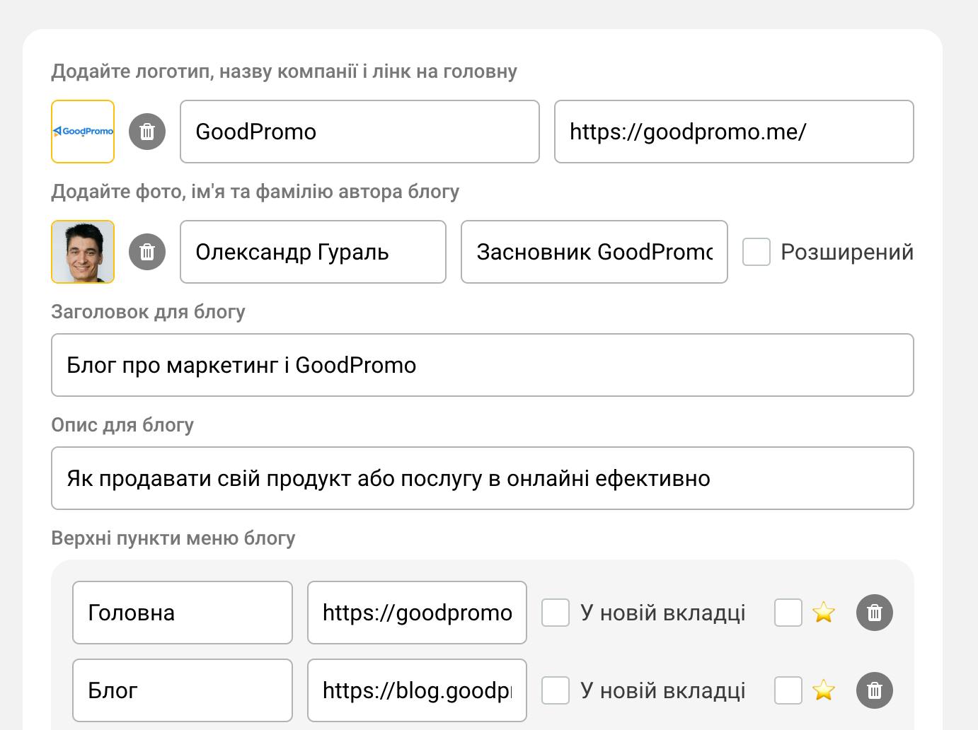 Все дуже просто – реєструєтесь в GoodPromo, створюєте свій блог, додаєте свій логотип і пункти меню