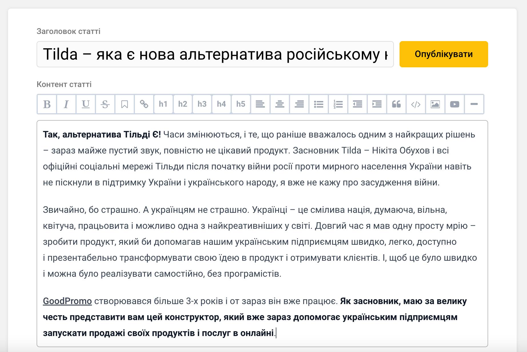 Створюєте першу статтю, натискаєте опублікувати і готово!