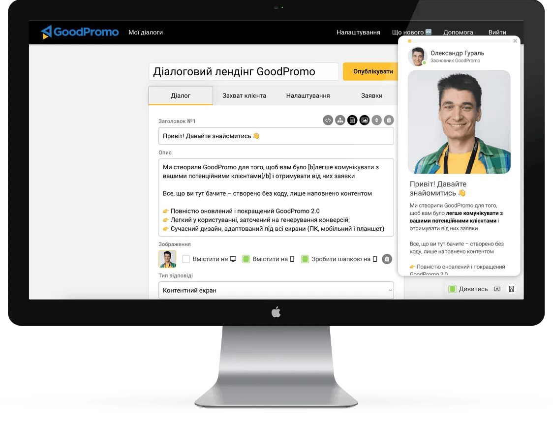 GoodPromo перетворює відвідувачів вашого сайта на покупців за допомогою інтерактивної взаємодії, схожої на гру – виявляючи потреби ваших потенційних клієнтів та пропонуючи їм найкраще рішення в результаті
