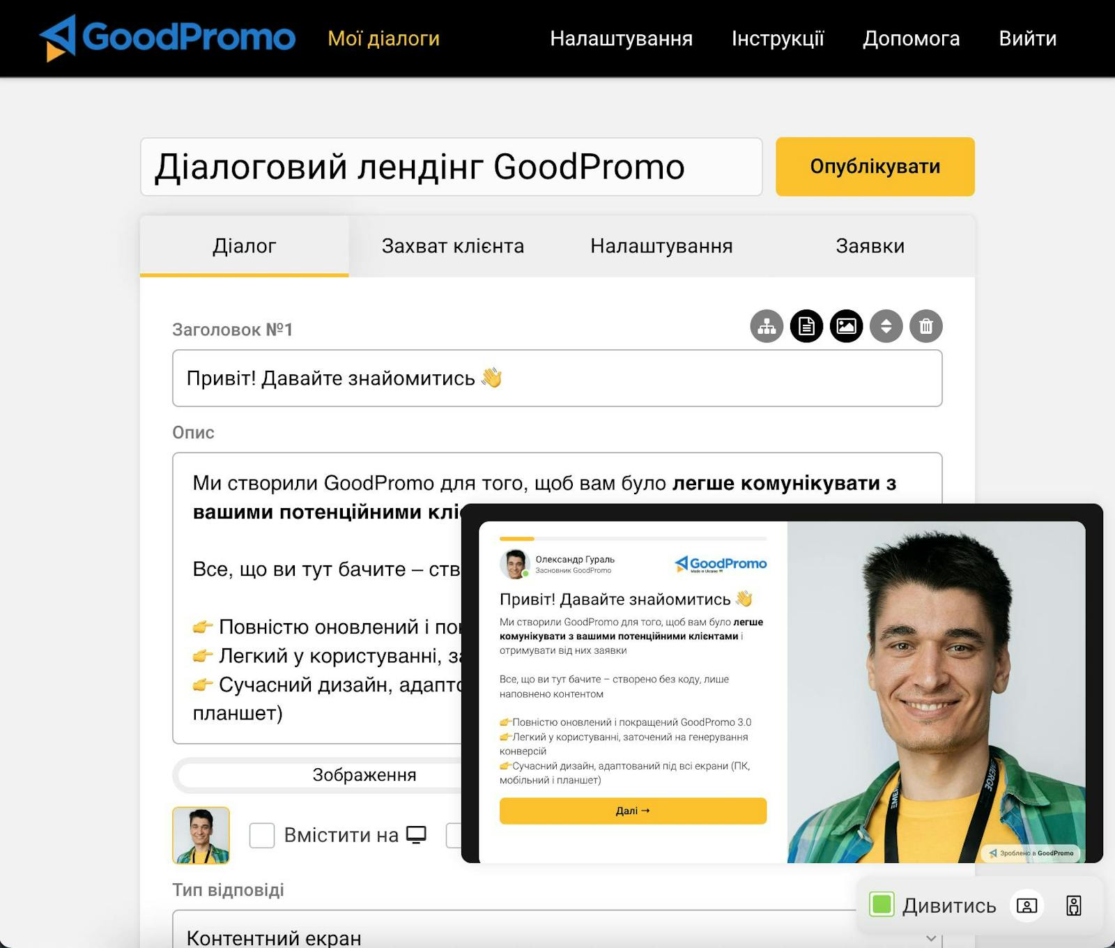 Вам не треба бути програмістом, веб-дизайнером чи SEO-спеціалістом. З GoodPromo ви робите легкі налаштування під себе і створюєте презентабельний лендінг!
