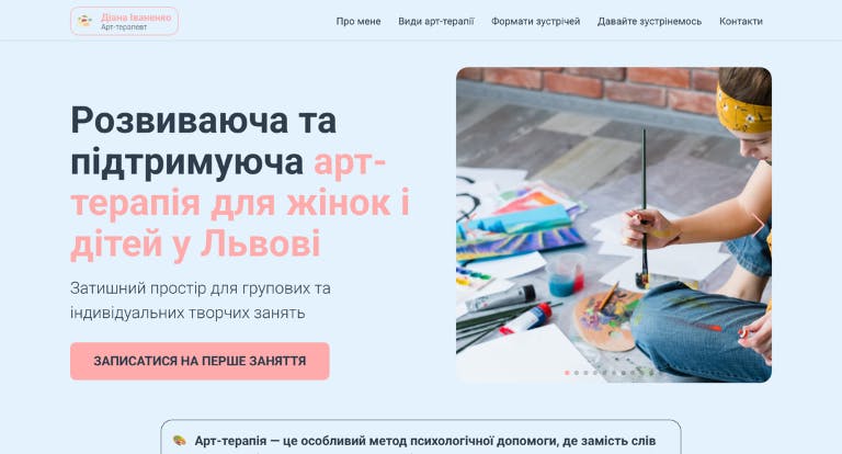 Лендинг для арт-терапевта, може бути адаптований під психологів, коучів або студії творчого розвитку👀 Подивитись шаблон
