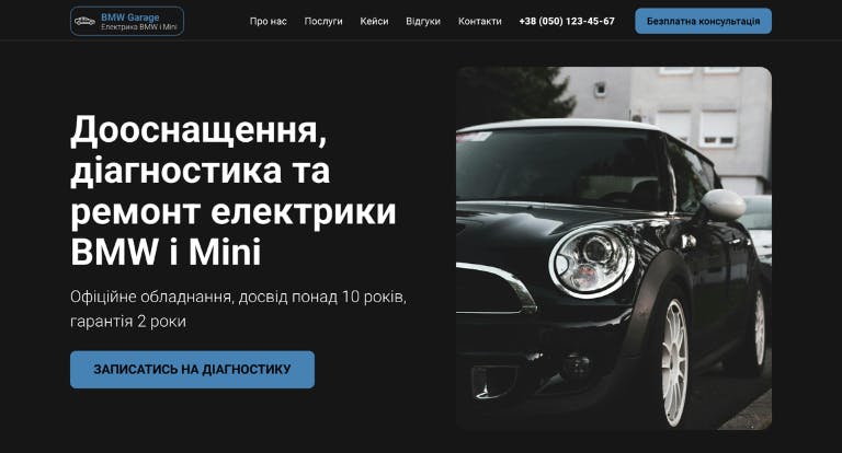 Лендінг по дооснащенню, діагностиці та ремонту електрики для BMW і Mini👀 Подивитись шаблон