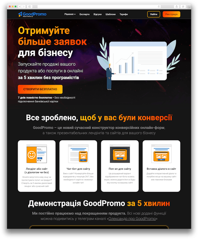 Створіть свій презентабельний сайт кліками – цей сайт також створено в конструкторі GoodPromo без коду кліками
